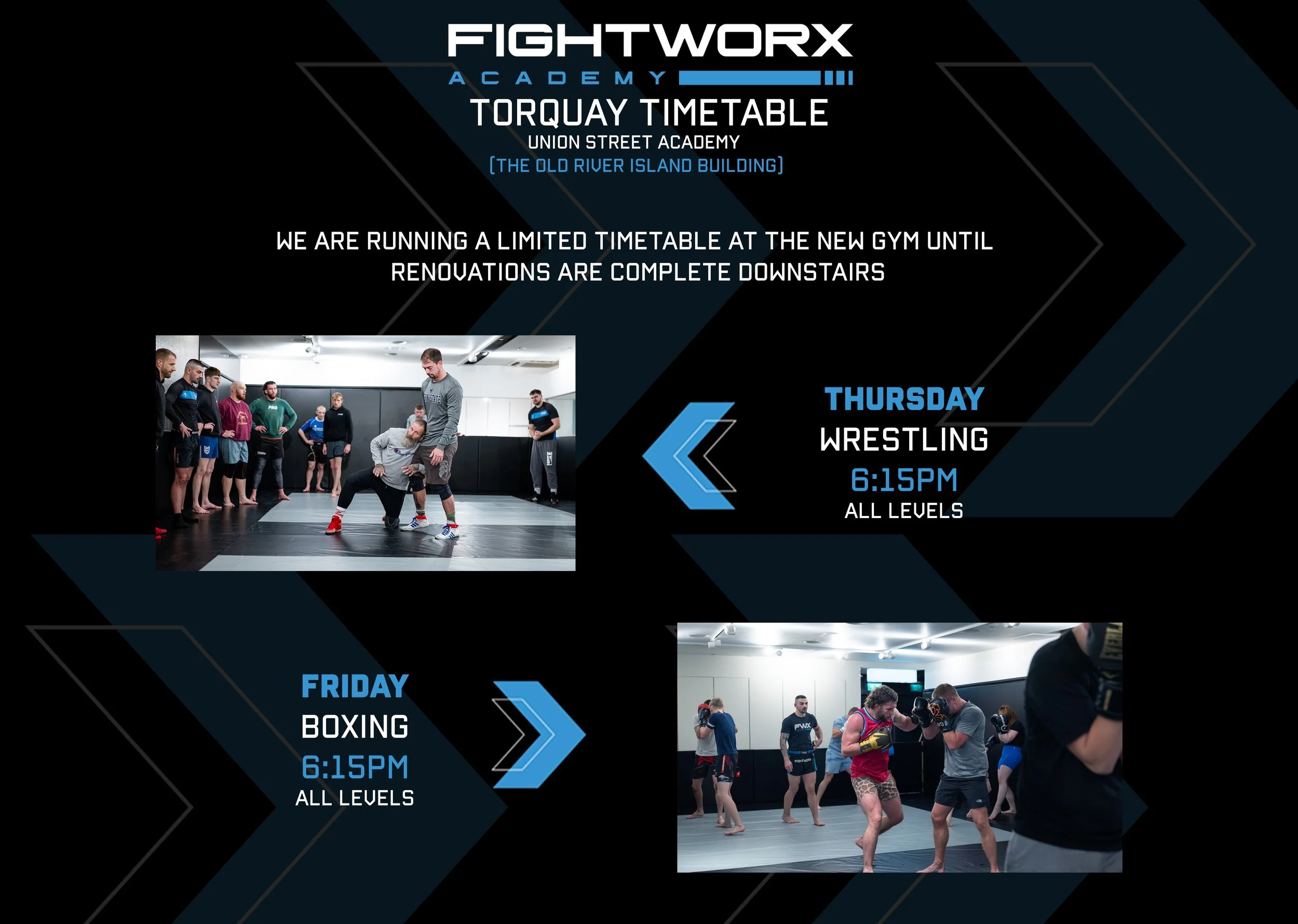 whilst renovations are completed on the new torquay academy, all classes will remain at the existing market street academy, with the exception of a few, new additional classes which are held at the new gym on union street (old river island building)